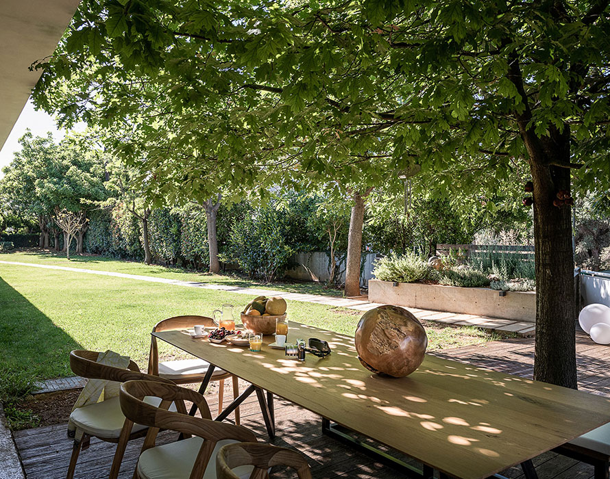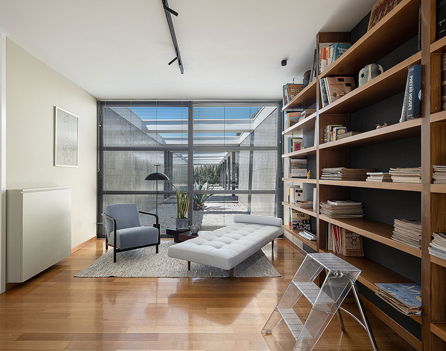 Additionally there is a family bathroom with double sinks and a shower cabin on this level. The office features an oak wood working desk and library as well as a stylish recliner which guarantees a quiet and calm area for studying or working. The office opens out to the same private patio as the master bedroom. The outdoor patio furniture is minimal design: together with white gravel paving, constitutes the patio area where the concrete elements embrace the structure.