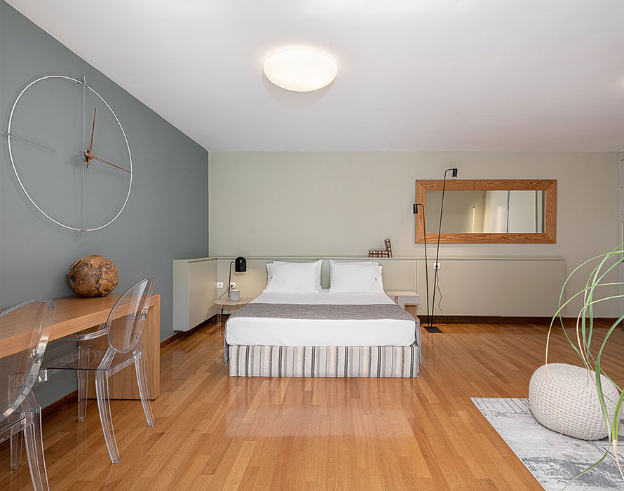 A collection of 80 vintage film cameras dated from 1890 till 1980’s is featured on this level. Interior details and furnishing, combine simplicity and sumptuousness with the use of oak and African teak wood and Inox steel surfaces. Oil paintings and gravures share splashes of color and convert the living area into an experience of art and a standing piano is also available.